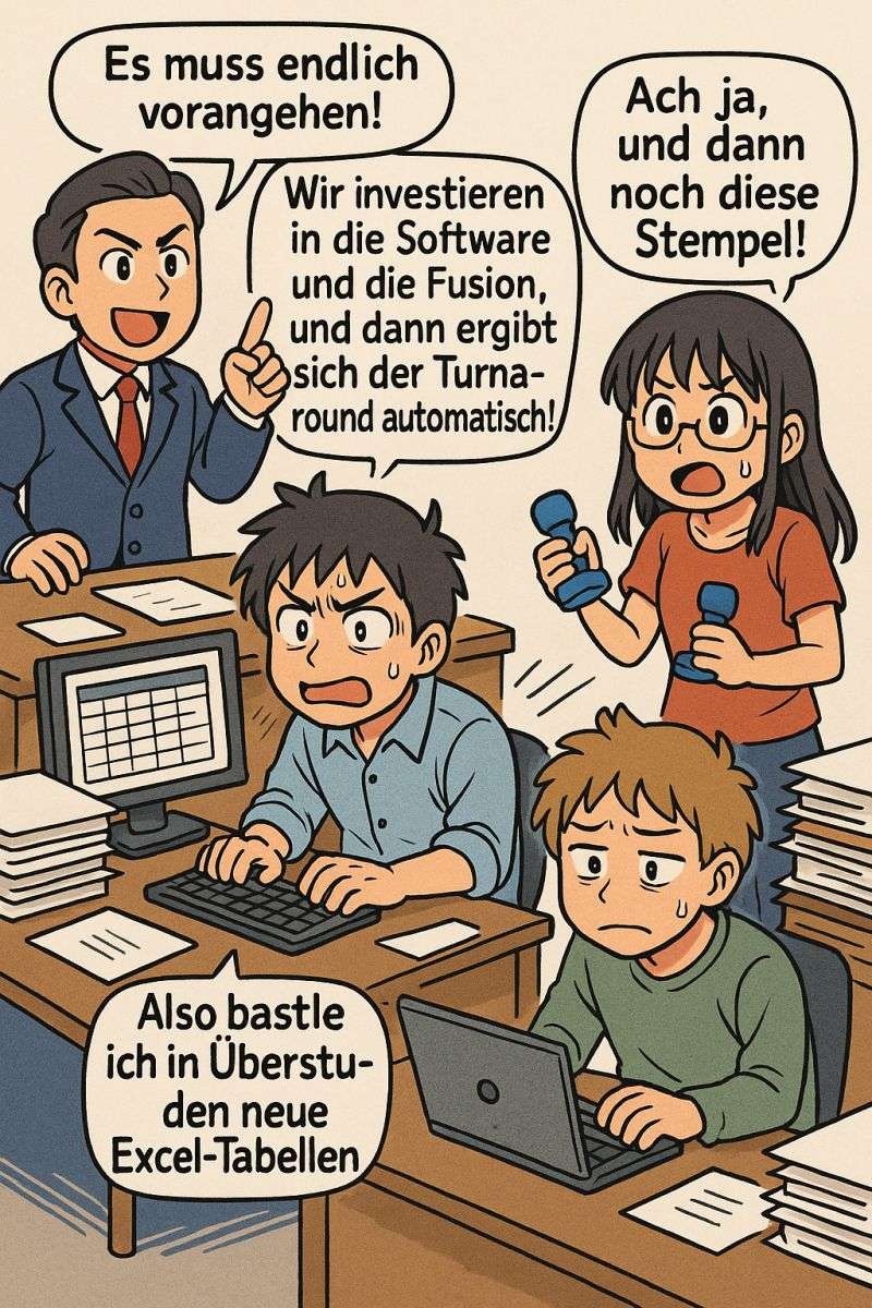 Nur leider hatte niemand daran gedacht, dass man bei einer Fusion nicht nur die Logos neu drucken muss – sondern auch zig neue Vorgänge entstehen.