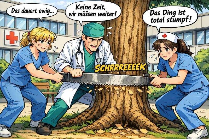 Einer sagt: „Lass uns kurz das Sägeblatt schärfen.“